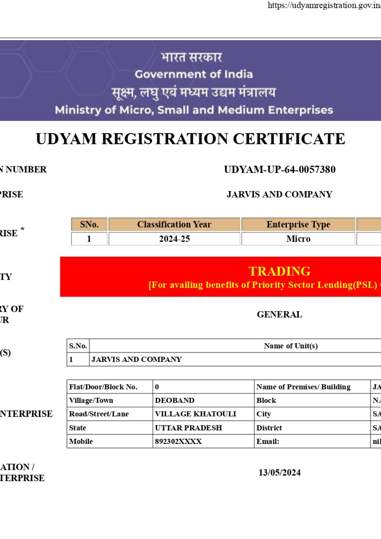 Udyam Registration Certificate (MSME)